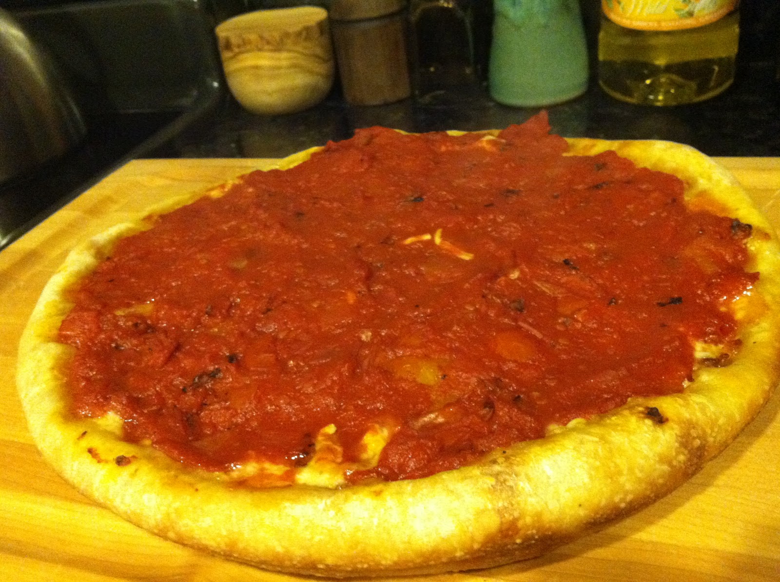 I used this Cast Iron Pizza recipe, adapting it quite a bit. First, I use this pizza dough recipe from Bon Appetit. We brushed some melted butter on the bottom and sides of our pan to give it a nice buttery taste. For toppings, we browned some spicy Italian sausage (we used one link, removing it from the casing, but I might use 2 in the future for our 12" cast iron). We also sauteed some sliced mushrooms (6 large cremini) and chopped garlic (2 cloves) in olive oil. Once the dough was in the pan, we put the toppings in first, then the cheese, then a can of crushed tomatoes (drained of juices). We cooked the pizza as directed in the Cast Iron Pizza recipe and voila!